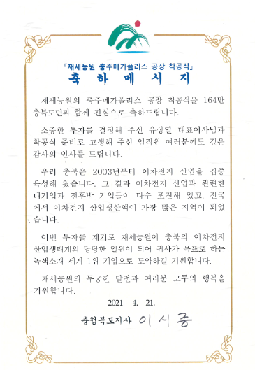 韓國(guó)忠清北道省長(zhǎng)發(fā)來賀詞:“忠清北道是韓國(guó)鋰電池生產(chǎn)總額最高的地區(qū),感謝容百選擇加入!衷心期待容百成為綠色材料的全球領(lǐng)先企業(yè)?!?/span>